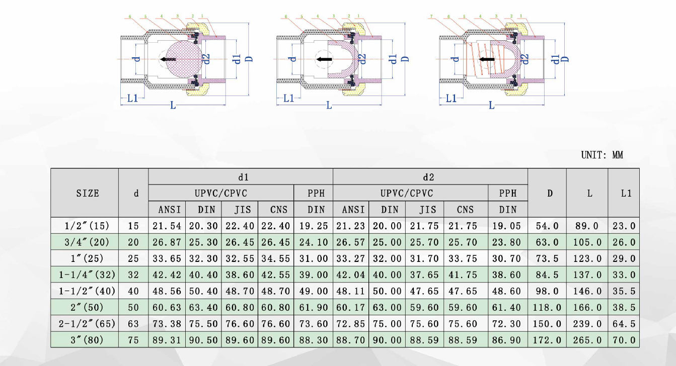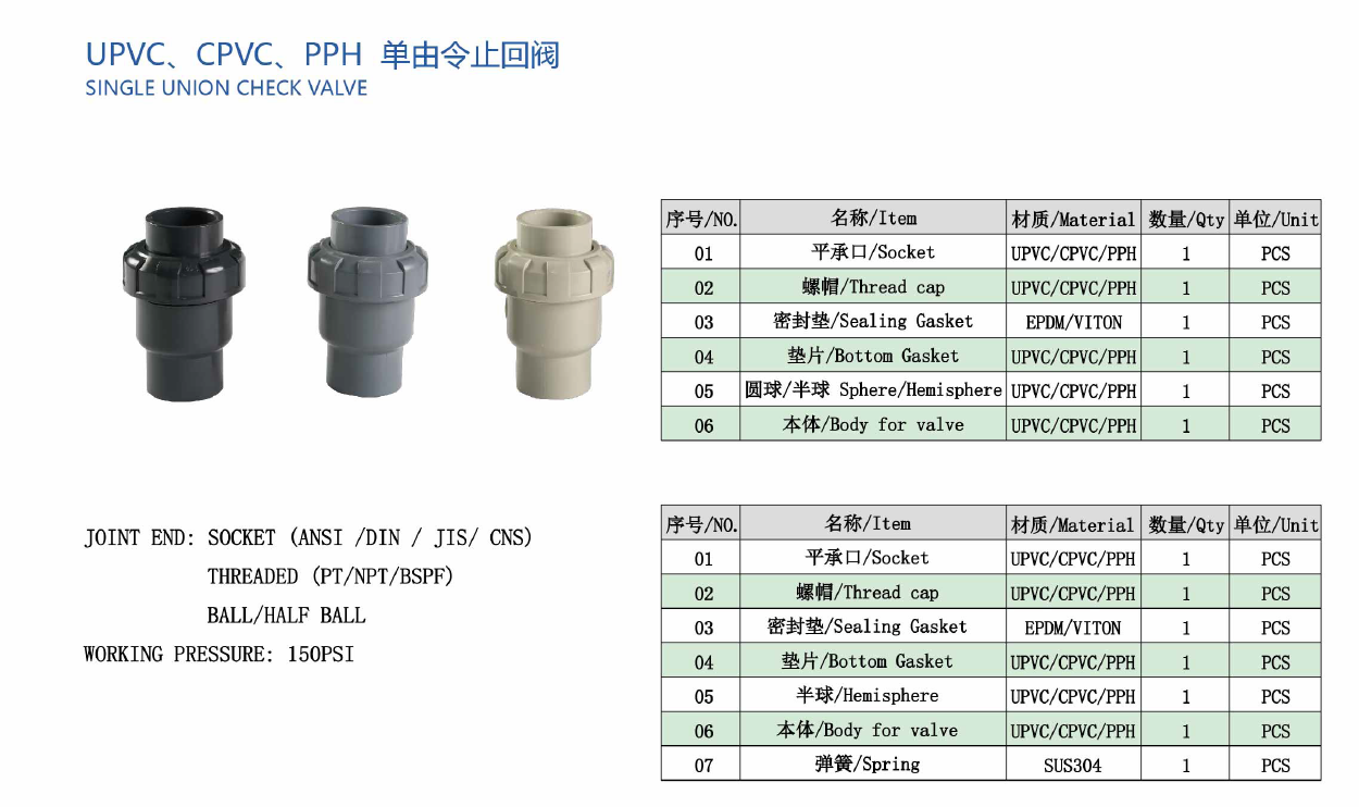 UPVC 、 CPVC、 PPH SINGLE UNION CHECK VALVE