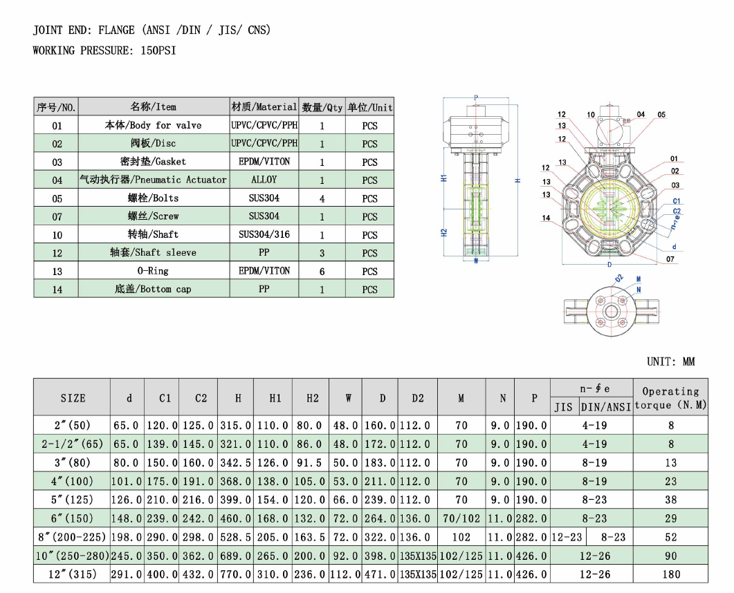 UPVC 、 CPVC、 PPH 气动式蝶阀品牌:WF标准:美标/国标/日标尺寸; 2"-12" (DN50-DN315)工作压力: 150PSIO型橡胶密封圈: EPDM/VITON连接方式:法兰 (ANSI/DIN/JIS/CNS)