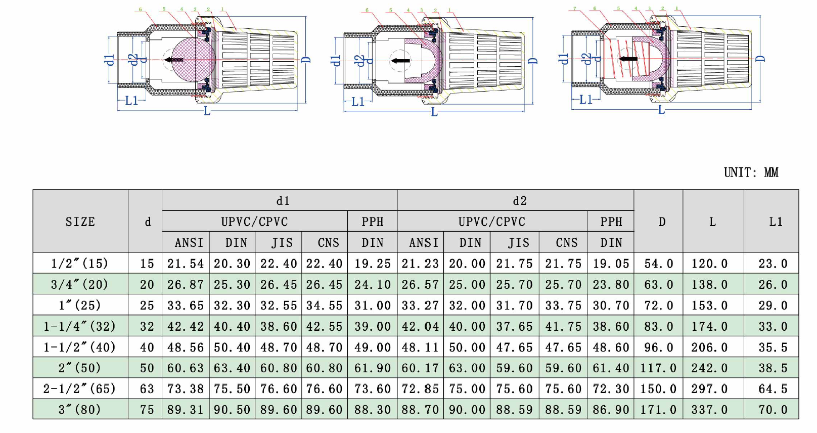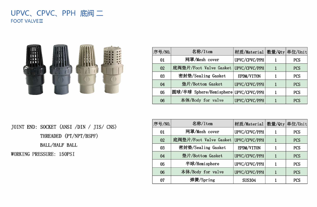 UPVC 、 CPVC、 PPH 底阀品牌:WF标准:美标/国标/日标/台标尺寸; 1/2"-3" (DN15-DN80)工作压力: 150PSI密封垫: EPDM/VITON连接方式: 承插 (ANSI / DIN / JI S/ CNS), 螺牙 (PT / NPT/ BSPF)